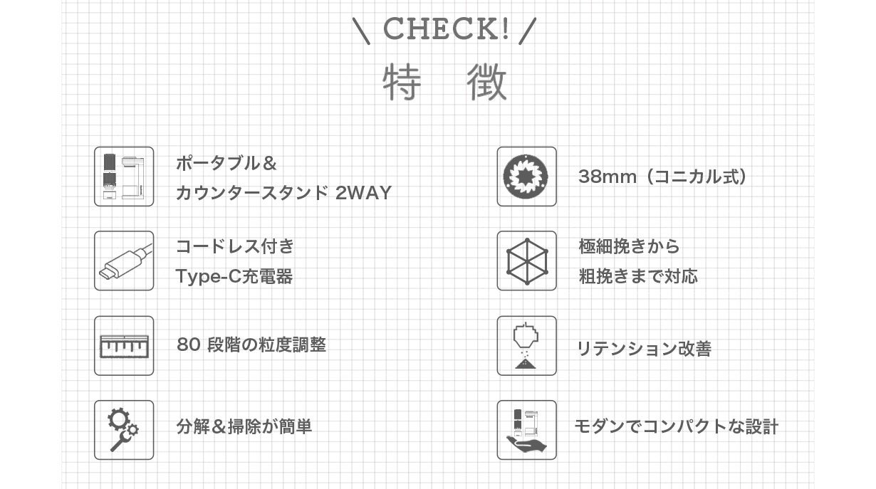 しかし、挽きたてのコーヒーを楽しみたくても、静電気の起きやすい冬場や、コーヒー粉の飛び散りによるキッチン廻りが粉まみれになる悩みやコーヒー粉が減ってしまうという悩みをもつユーザーの声を少しでも応えるためにGround-Essence Shield(グラウンド エッセンスシールド)を設計しました。摩擦熱の発生が少なく、静電気や微粉の発生を抑えるだけでなく、貴重なコーヒー粉を十二分に堪能して欲しいという思いから、細部までこだわったグラインダーで芳香の至福を感じてください。