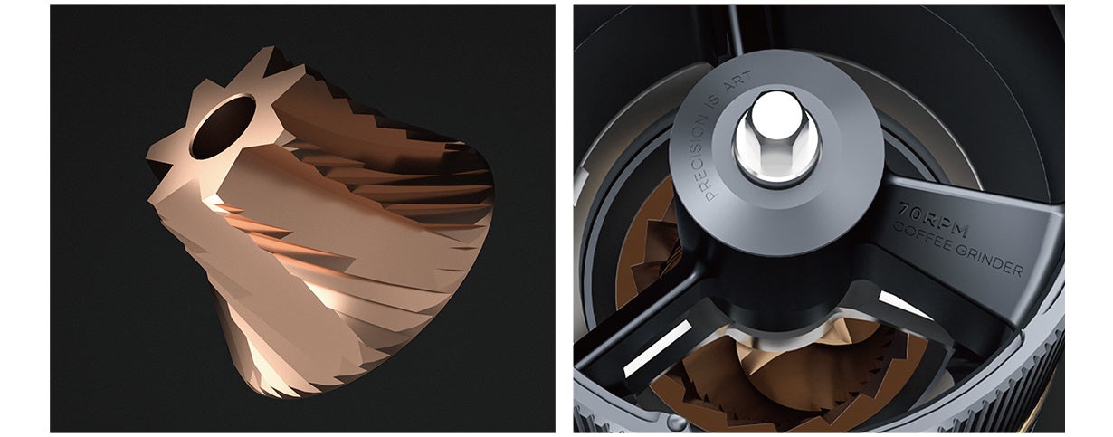 挽き目によって味が大きく変化するコーヒーは、挽き目が粗いと、抽出率や濃度が低下し、酸味が強いコーヒーになります。 挽き目を細かくすると抽出率や濃度が上昇しますが、苦みが主張したコーヒーになります。その特性を考慮して手軽に、自在に、自分好みの味を愉しめるように、1分間に70RPMというスピードでアプローチ。