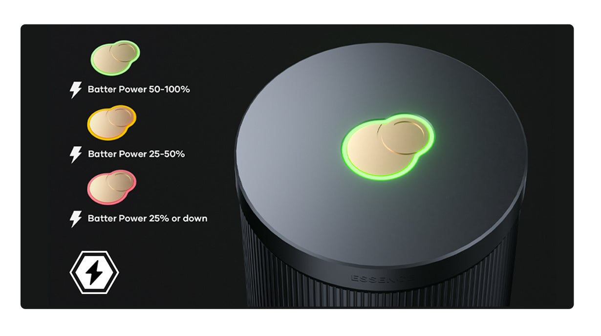 上部のオン/オフ ボタンに、現在のバッテリー レベルを表示。リアルタイムでバッテリー残量を色で教えてくれるから、外出先で充電に困ることがありません。万が一、充電残量が少ない場合は、カーチャージャー(Type-C対応の物に限る)で充電いただけます。 ESNECEのフル充電には約120分かかり、約60分の作業時間で25回研ぐ(50〜70目盛りの場合)ことができます。
