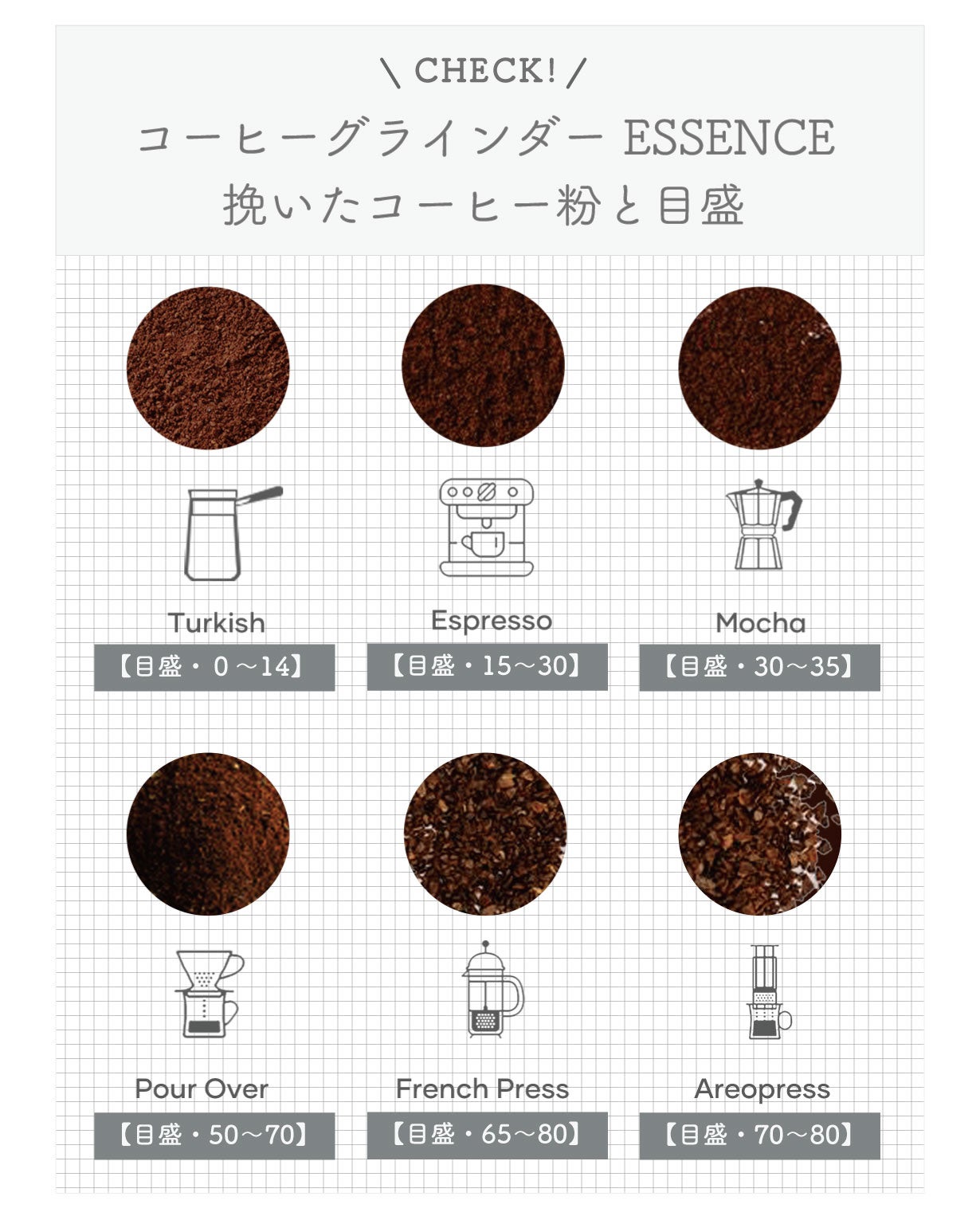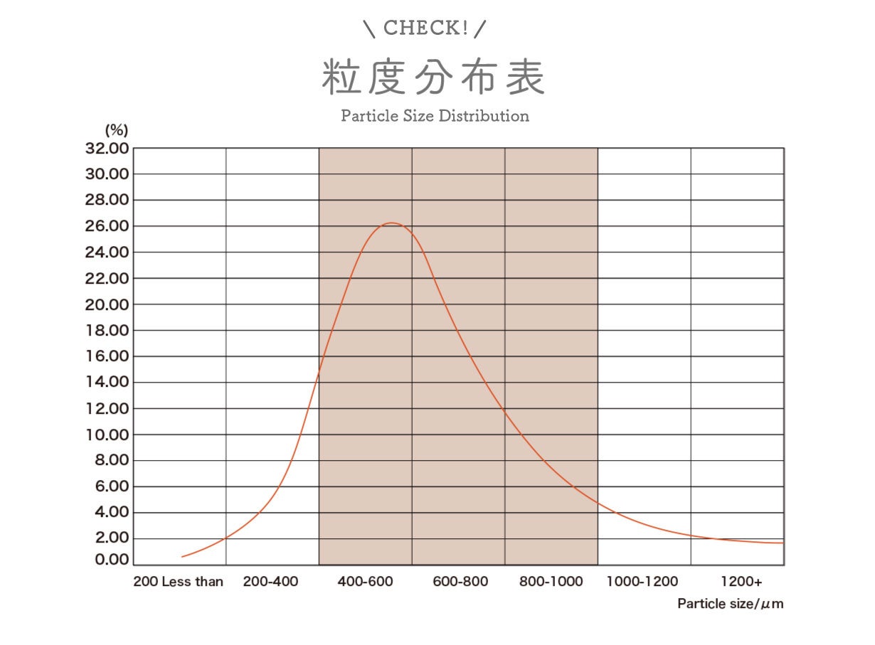 グラインダーの性能では、コーヒー本来の美味しさを堪能いただけるように 0 ~ 80 レベルで微調整し、150 ~ 1400um の極限まで均一性のとれた安定した粒度を実現。