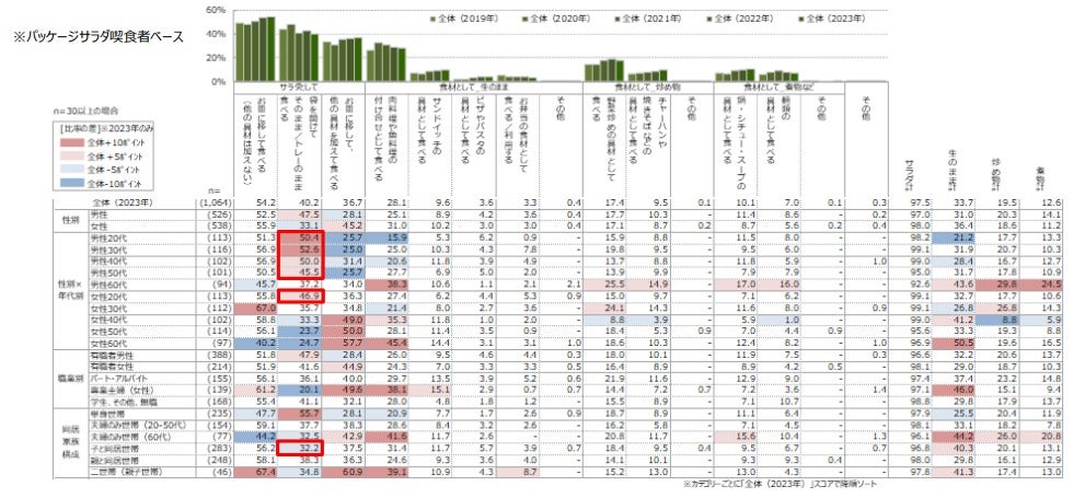 パッケージサラダの利用方法について、女性40代~60代、専業主婦(女性)、二世帯(親子世帯)は「お皿に移して、他の具材を加えて」食べることが多い一方、男性20代~50代、女性20代、単身世帯は、パッケージサラダの「袋を開けてそのまま/トレーのまま」食べると答えた人が他属性より多い結果となりました。特に単身世帯は過半数がパッケージサラダを袋やトレーのまま食べると答えています。もともと時短アイテムとして使用されているパッケージサラダですが、“タイパ”を高めたい時流のなか、より手間や時間をかけず且つ洗い物も少なくする食べ方を好む人が多いことがわかります。