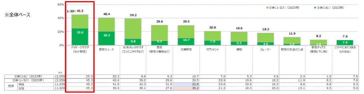 野菜不足解消に利用したい商品(1-3位計)は、「パッケージサラダ」が45.3%と最も多く、次いで「野菜ジュース」が40.4%、「出来合いのサラダ」が39.2%と続きます。2015年から同様の意識調査をするなかで、「野菜ジュース」が長年継続的に1位でしたが、昨年初めて「パッケージサラダ」が1位となりました。また、「パッケージサラダ」の利用意向は、男女共に差がなく最も高い結果となっています。
