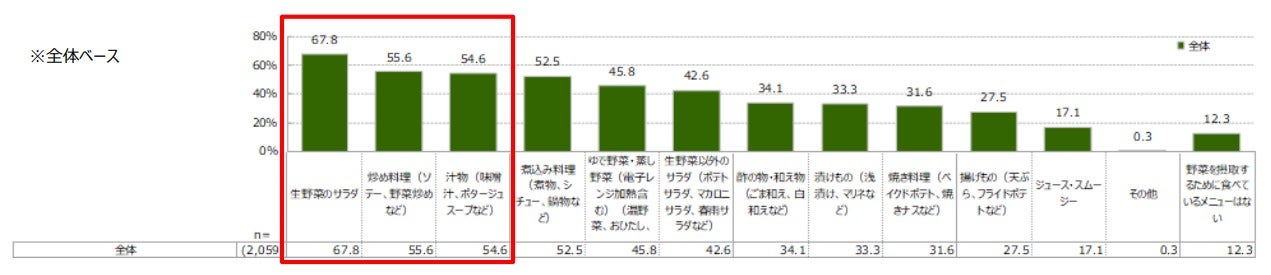 野菜を摂取するために食べているメニューを尋ねたところ、1位が「生野菜のサラダ(67.8%)」と最も多く、「炒め物(55.6%)」、「汁物(54.6%)」と続きました。また、サラダで野菜を食べている理由として、美味しさや栄養価、調理の簡便性に加え、食事の最初に食べることで急激な血糖値上昇を抑える“ベジファースト”を実践できるからという意見もありました。