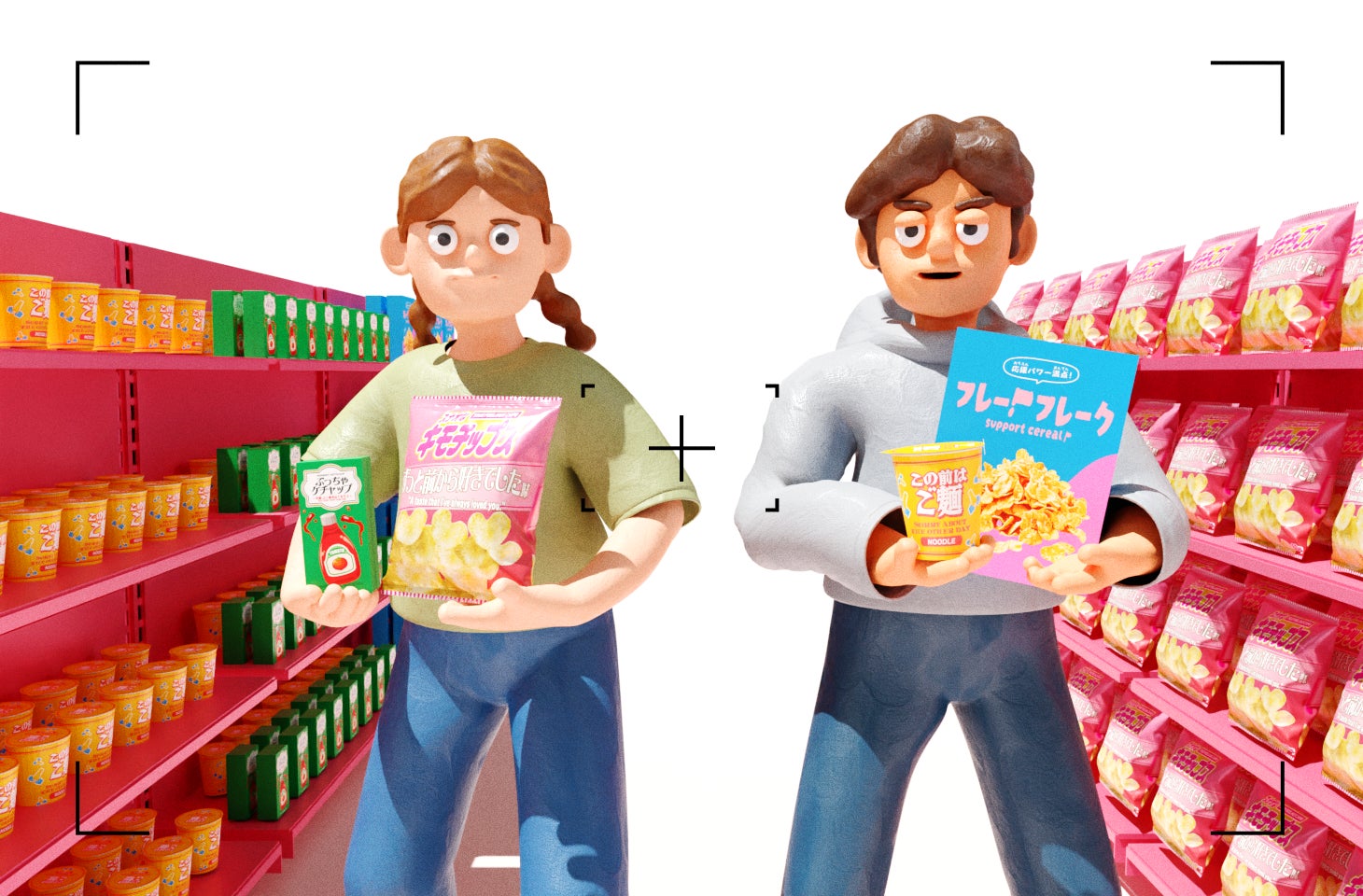 キモチキオスクの店頭には、感謝、好き、ねぎらい、反省、謝罪など、一人ひとりのキモチを伝える、ありそうでなかった商品群が並びます。商品は全46種類。実際のご購入やお召し上がりいただくことはできませんが、商品を手に取る過程で、素直なキモチを通わせるひとときをお届けします。