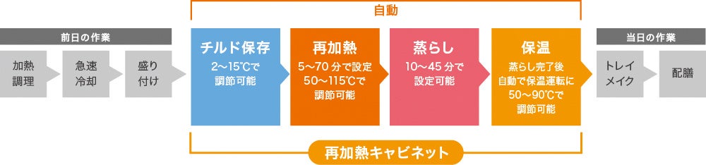 再加熱キャビネットは1台でチルド保存、再加熱、保温の機能を備えており、施設で調理した食事や仕入れた食事を、指定した時間に温かい状態にします。熱風による加熱と蒸気による加湿で、ご飯もふっくらおいしく仕上がります。前日の準備で、翌朝の早朝出勤人員を減らせるほか、湯煎方式の再加熱と比べ、火傷などの事故削減にもつながります。病原菌の増殖を抑制する65℃以上で保温するため、食の安全も保てます。
