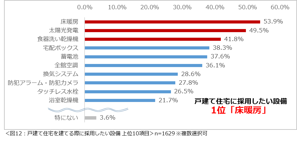 戸建て住宅を建てる際に採用したい設備は「床暖房」が最多で半数以上。
