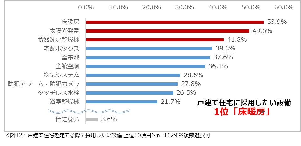 もし戸建て住宅を建てるなら、採用したい「設備」と「間取り」について尋ねたところ、設備面での1位は「床暖房」(53.9%)でした。また、2位は「太陽光発電」(49.5%)、3位は「食器洗い乾燥機」(41.8%)と続きました。(図12)