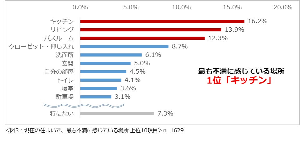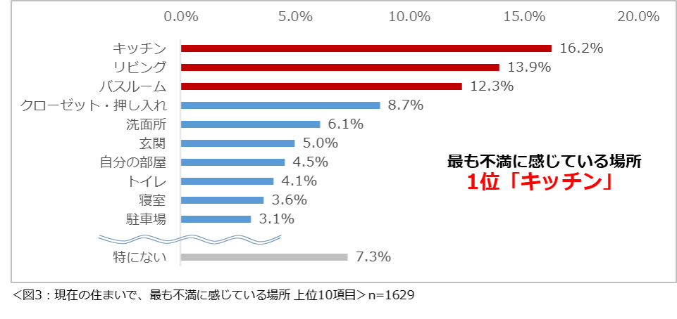 現在の住まいで最も不満に感じている場所を尋ねたところ、「キッチン」(16.2%)という回答が最も多く、次いで2位が「リビング」(13.9%)、3位「バスルーム」(12.3%)という結果になりました。(図3)
