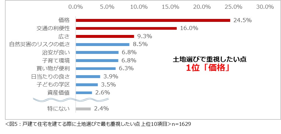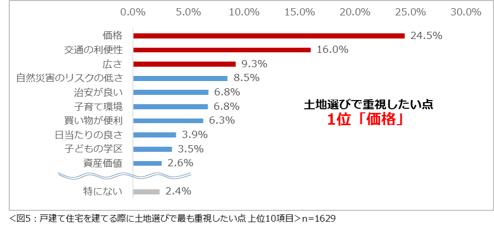 もし戸建て住宅を建てるなら、土地選びで最も重視したい点を尋ねたところ、「価格」(24.5%)という回答が最も多く、次いで2位が「交通の利便性」(16.0%)、3位「広さ」(9.3%)という結果になりました。(図5)