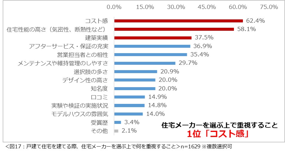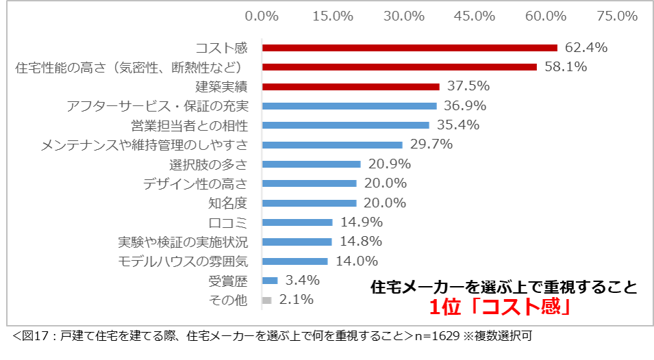 戸建て住宅を建てる際に住宅メーカーを選ぶ上で重視すること1位は「コスト感」。