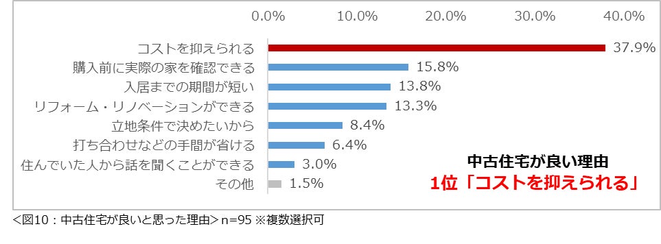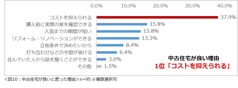 購入を希望する住宅の種類が「規格住宅」と回答した272名、「建売住宅」と回答した141名、「中古住宅」と回答した95名にそれぞれその理由を尋ねたところ、いずれも「コストを抑えられる」という回答が最多でした。(図8)(図9)(図10)