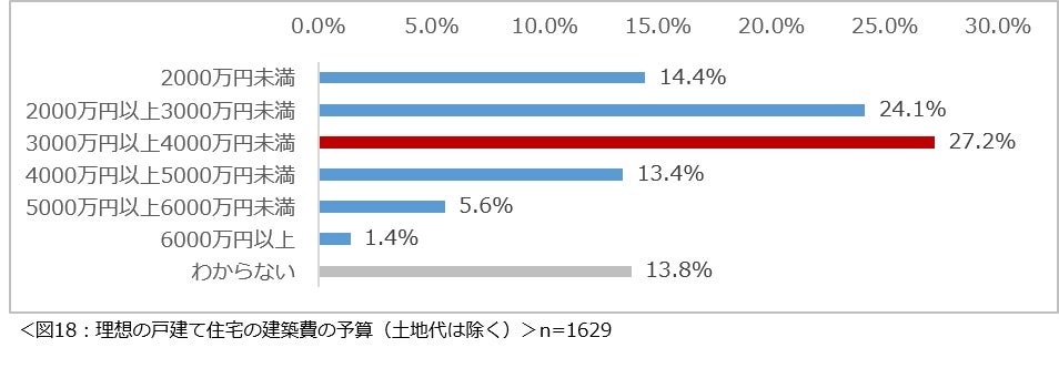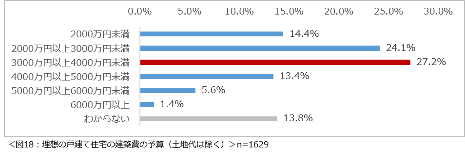 理想の戸建て住宅の建築費の予算について尋ねたところ、「3000万円以上4000万円未満」(27.2%)という回答が最多となりました。(図18)