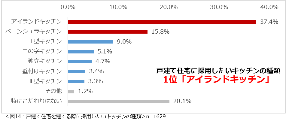もし戸建て住宅を建てるなら、採用したいキッチンの種類について尋ねたところ、周囲に壁がない、文字通り島のように設置されている「アイランドキッチン」(37.4%)が1位、次いでキッチンの左右どちらかが壁に接している「ペニンシュラキッチン」(15.8%)を希望していることが分かりました。(図14)