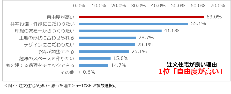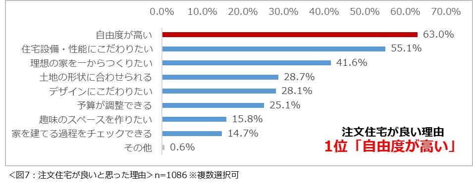 戸建て住宅を購入する際に「注文住宅」を希望すると回答した1086名にその理由について尋ねたところ、「自由度が高い」という回答が最も多く63.0%という結果になりました。(図7)