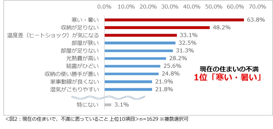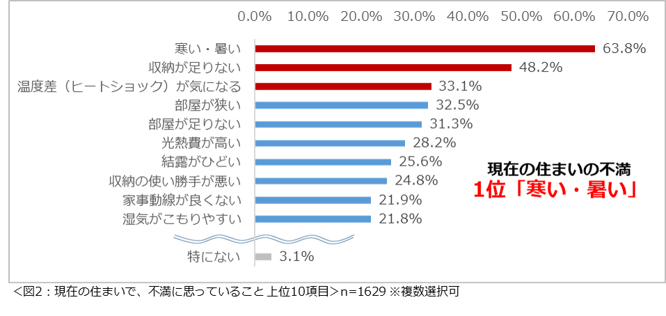 現在の住まいで、不満に思っていることを尋ねたところ、「寒い・暑い」(63.8%)という回答が最も多く、次いで2位が「収納が足りない」(48.2%)、3位「温度差(ヒートショック)が気になる」(33.1%)という結果になりました。(図2)
