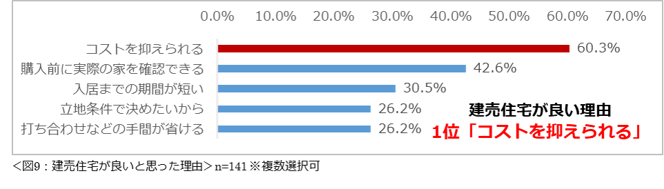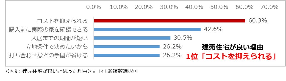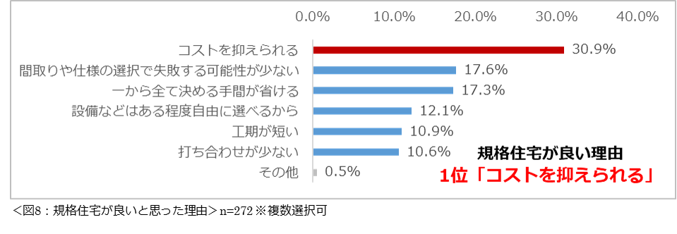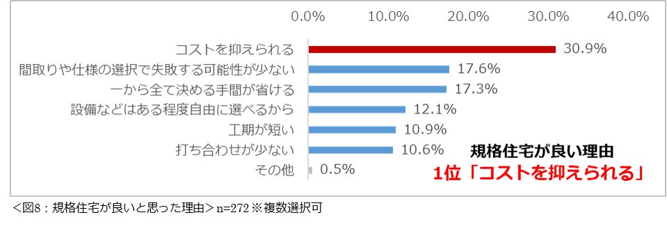 規格住宅、建売住宅、中古住宅を希望する理由1位はいずれも「コストを抑えられる」。