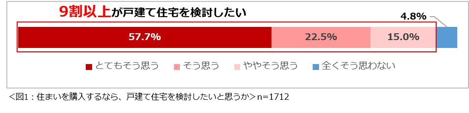 現在、賃貸または実家に住んでいると回答した1712名に、「もし住まいを購入するなら、戸建て住宅を検討したいと思いますか?」と尋ねたところ、「とてもそう思う」57.7%、「そう思う」22.5%、「ややそう思う」15.0%を合わせると、9割以上の人が戸建て住宅を検討したいと思っていることが分かりました。(図1)