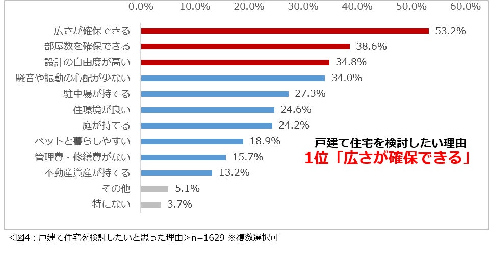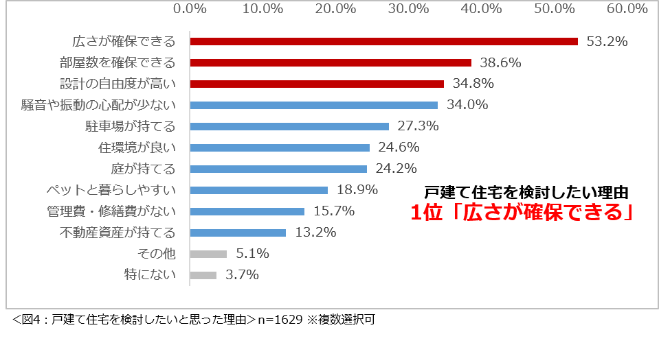 戸建て住宅を検討したいと思った理由を尋ねたところ、「広さが確保できる」(53.2%)という回答が最も多く、次いで2位が「部屋数を確保できる」(38.6%)、3位「設計の自由度が高い」(34.8%)という結果になりました。(図4)