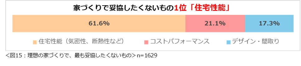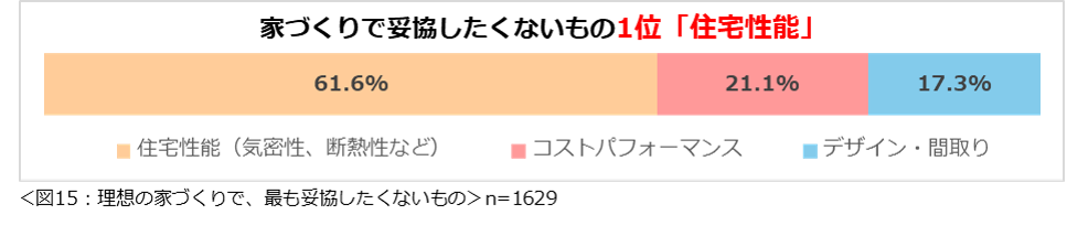 理想の家づくりで「最も妥協したくないもの」について尋ねたところ、「住宅性能」(61.6%)が最多となりました。(図15)