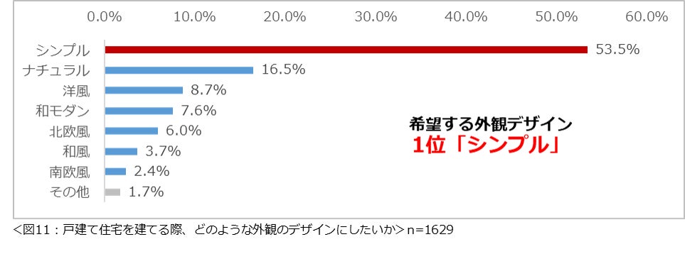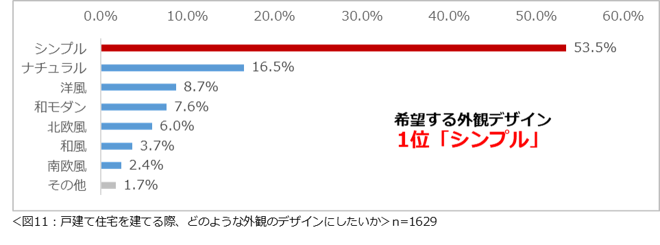 もし戸建て住宅を建てるなら、どのような外観のデザインが良いか尋ねたところ、「シンプル」(53.5%)が1位となりました。(図11)