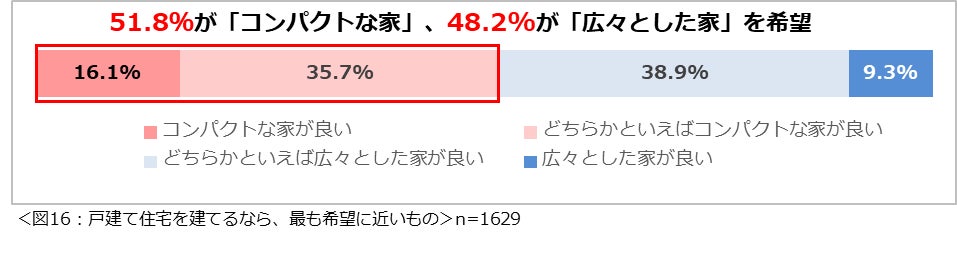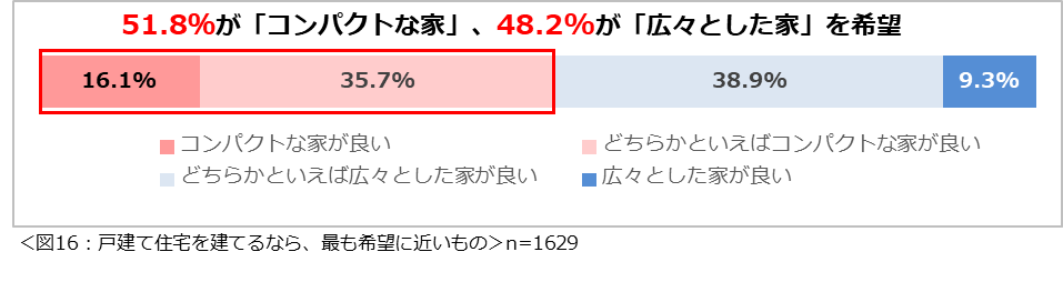 もし戸建て住宅を建てるなら、「コンパクトな家」と「広々とした家」のどちらを希望するか尋ねたところ、「コンパクトな家が良い」(16.1%)と「どちらかといえばコンパクトな家が良い」(35.7%)を合わせて51.8%、「広々とした家が良い」(9.3%)と「どちらかといえば広々とした家が良い」(38.9%)を合わせて48.2%と、ほぼ同数という結果になりました。(図16)