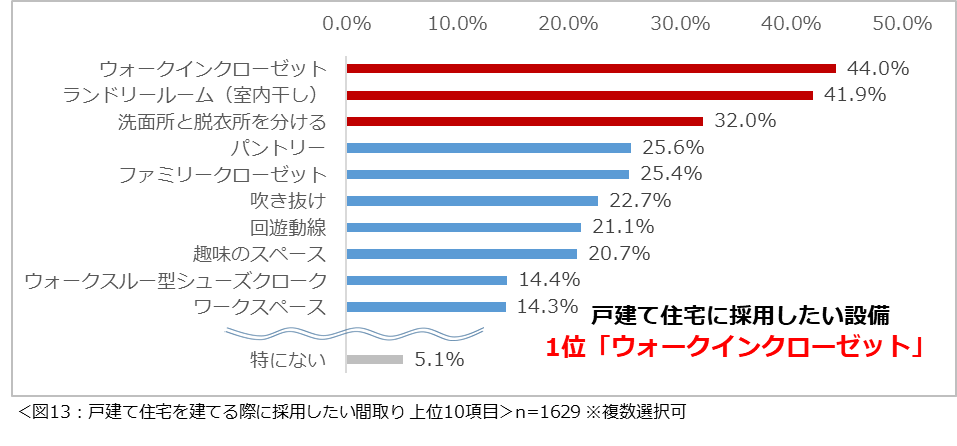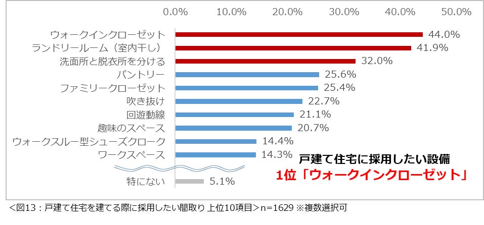 採用したい間取りは、「ウォークインクローゼット」(44.0%)が最多。「ランドリールーム(室内干し)」(41.9%)、「洗面所と脱衣所を分ける」(32.0%)と続きました。(図13)