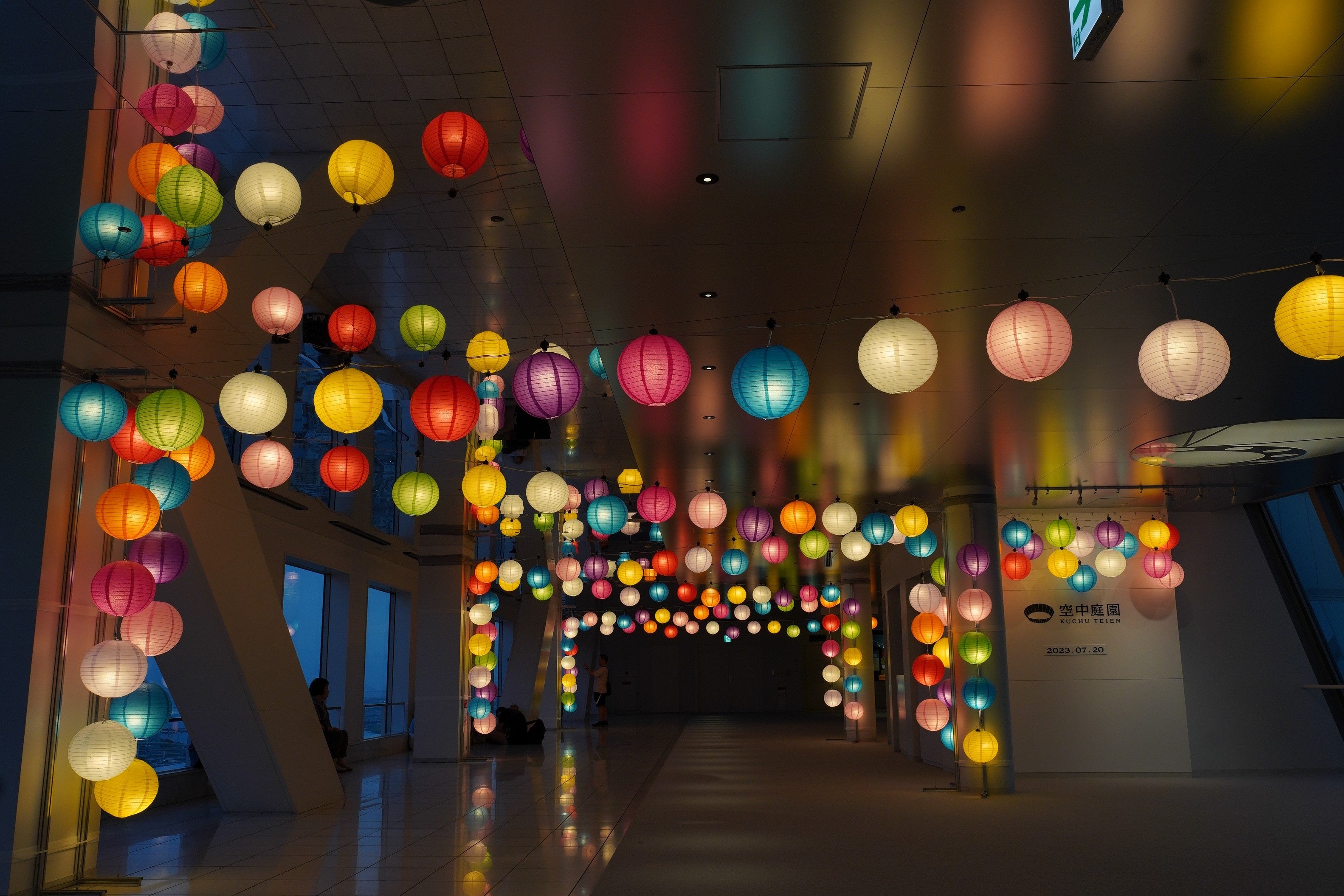 地上173mの空中庭園展望台を彩る色鮮やかなランタンと光る和傘「KASA HOTARU」