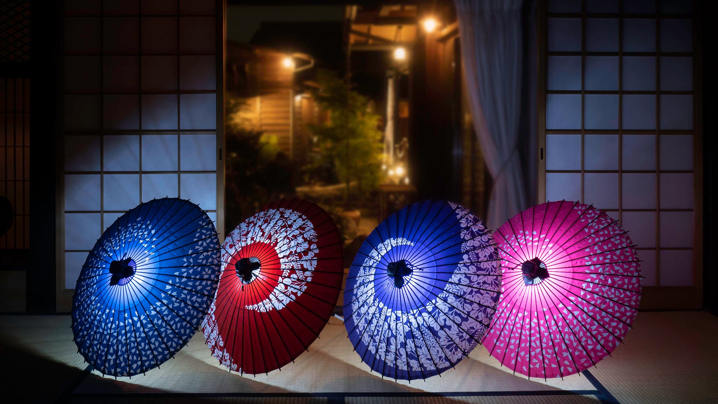 真っ白な空間に映えるカラフルなランタンと和傘のライトアップ