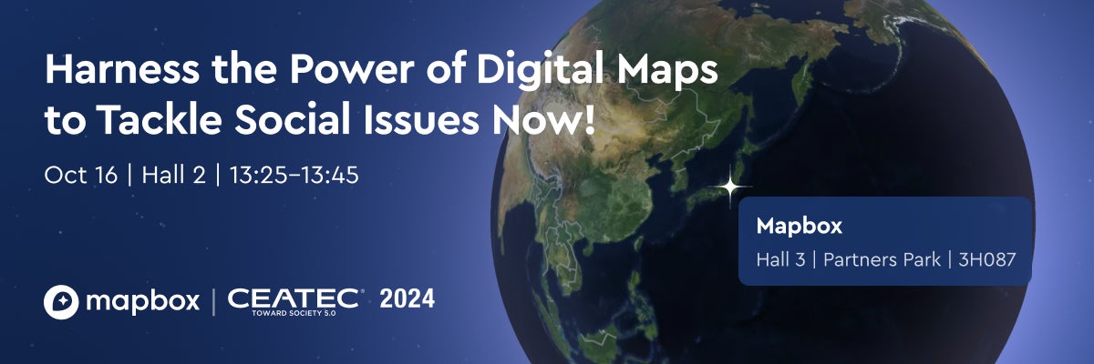 デジタル地図開発のリーディングカンパニーであるマップボックス社は、2024年10月15日(火)~18日(金)に幕張メッセ(千葉市美浜区)で開催される「CEATEC 2024(シーテック 2024)」に昨年に続き出展をいたします。自動車、物流、製造業、気象など多様な分野での最新の事例の展示に加え、10月16日(水)には、「今こそデジタル地図を活用して社会問題を解決してみませんか?」と題し、デジタル地図技術を利用して社会課題に立ち向かうセッションも開催します。