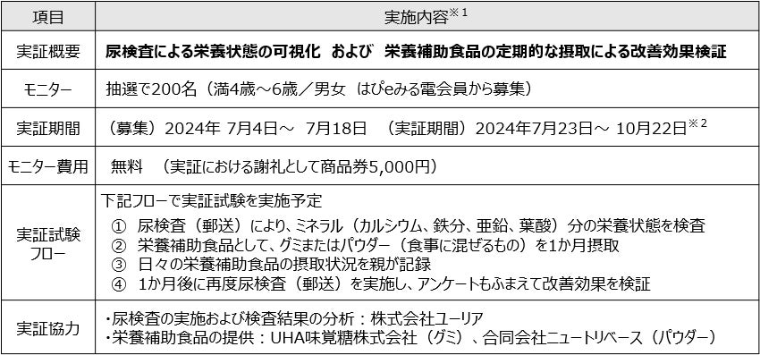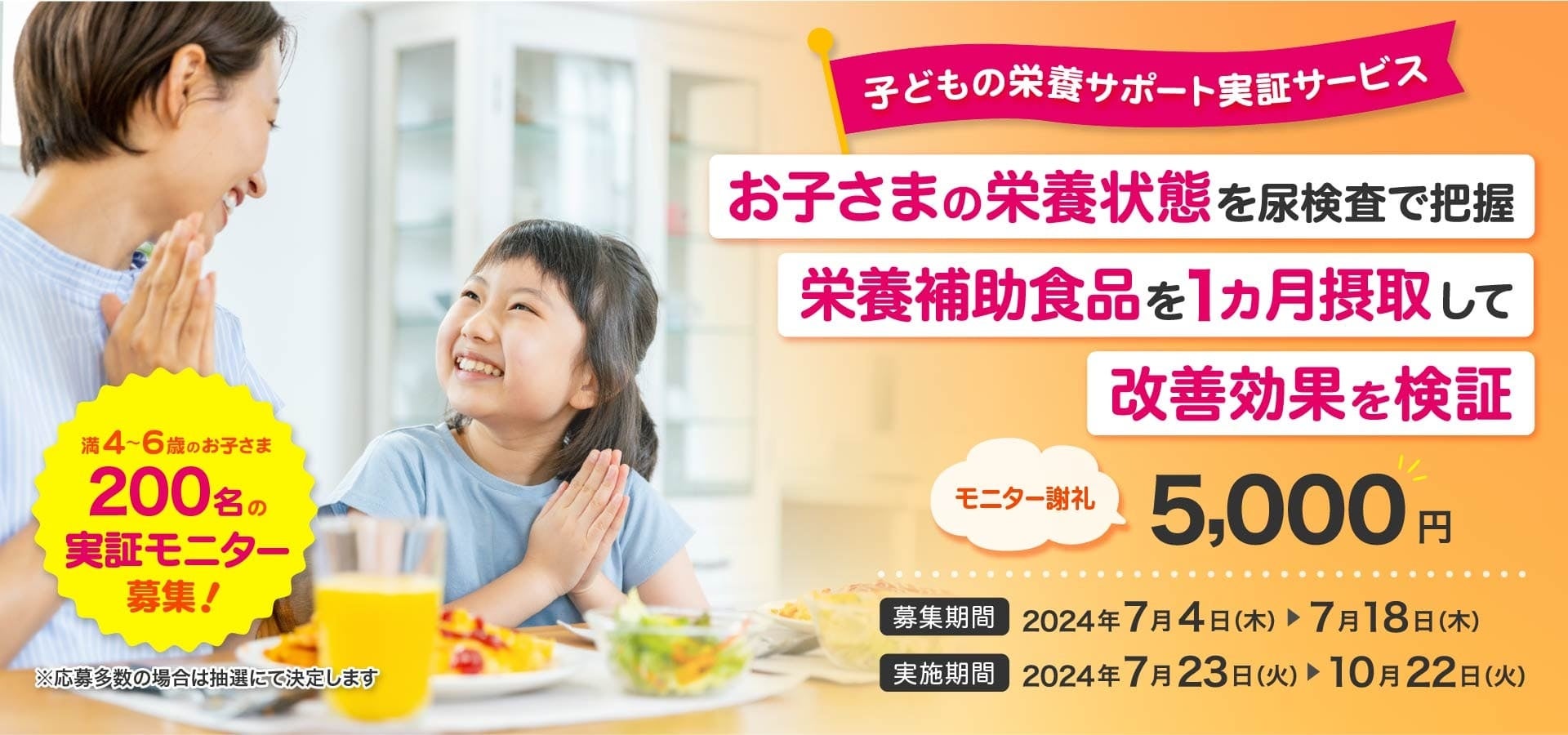 当社は、お子さまの栄養状態を尿検査で把握し、栄養補助食品を摂取いただいた改善効果を検証するための実証(以下、本実証)を本日から開始し、本実証にご協力いただけるモニターを200名募集いたします。
