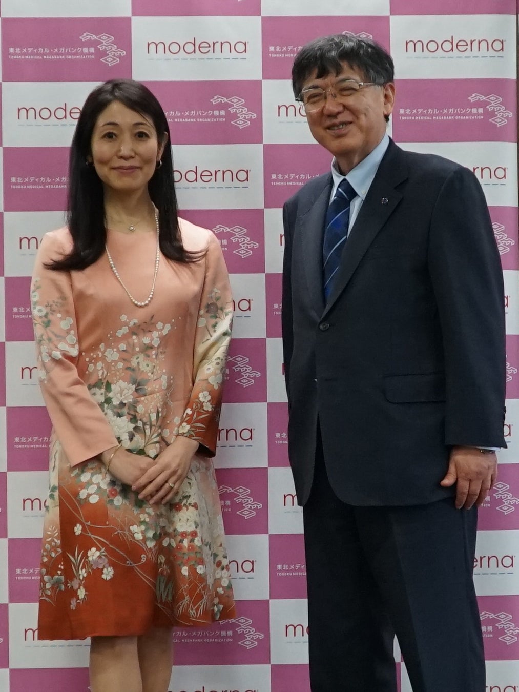 写真左:左からモデルナ・ジャパン株式会社 代表取締役社長 鈴木蘭美、国立大学法人東北大学 東北メディカル・メガバンク機構 機構長 山本雅之