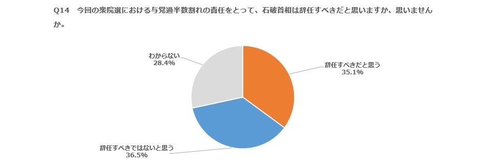 与党過半数割れの責任を取って石破首相が辞任すべきだと思う人が35.1%、辞任すべきではないと思う人は36.5%、わからないとした人は28.4%だった。