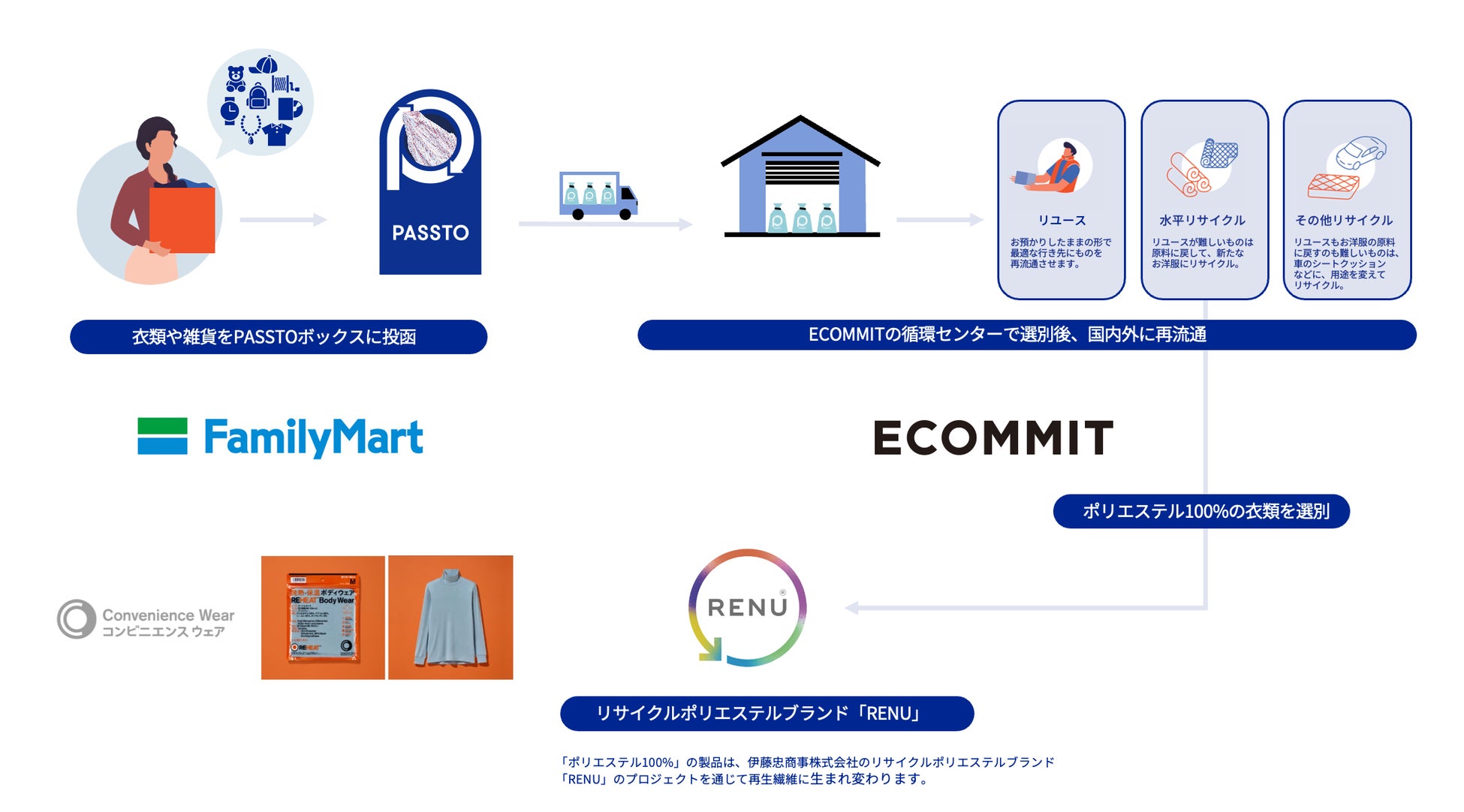 ECOMMITが運営する資源循環サービス「PASSTO」の不要品回収ボックスを東京都内にあるファミリーマート10店舗に設置し、不要になった衣類と雑貨の回収における実証実験を2024年12月16日から2025年6月15日まで実施します。回収した不要品は、ECOMMITが国内外でリユース品として再流通させるほか、リユースが難しいものはリサイクルパートナーを通じて再資源化等を行います。