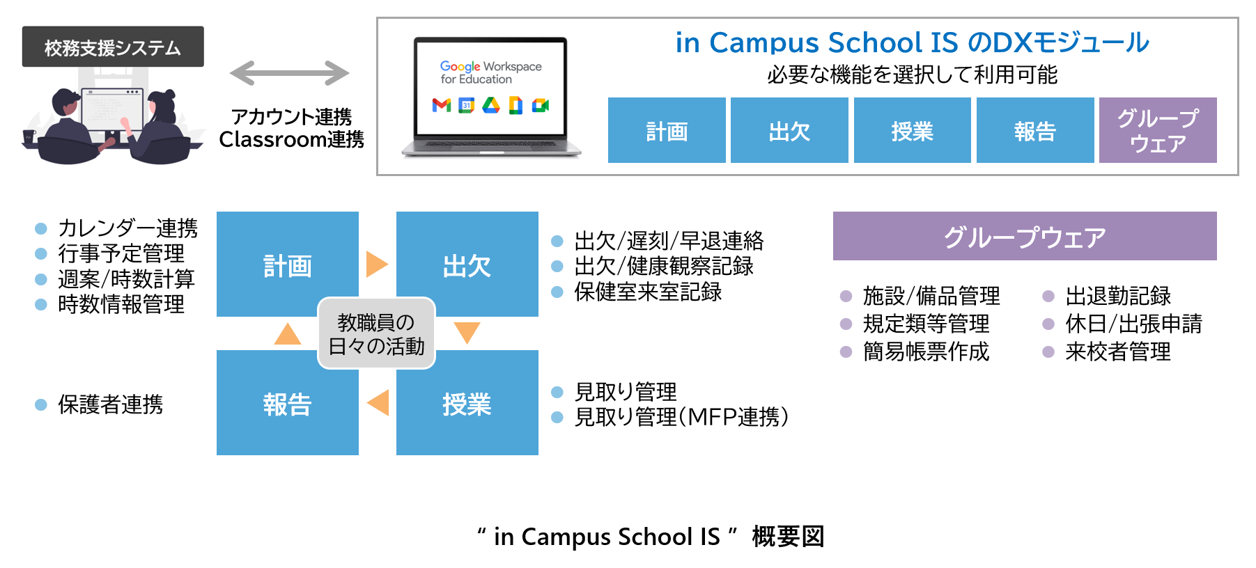 2019年に開始され、内閣府も国策として推し進めているGIGAスクール構想により、全国の児童/生徒に1人1台のコンピューター端末が配布され、ICTを活用した授業が定着しつつあります。このような状況の中、学校ではICT環境の利活用に大きな差が出ていることに加えて、教職員1人あたりの業務負荷が増大しており、「働き方改革」「業務の効率化」への対応が求められています。 こうした学校および教職員の課題を解決し、「個別最適な学び」と「協働的な学び」の充実に貢献するために、公立の小中学校で多く採用されている Google Workspace for Education と連携可能な『in Campus School IS』を開発し、キヤノンITSより販売することにいたしました。