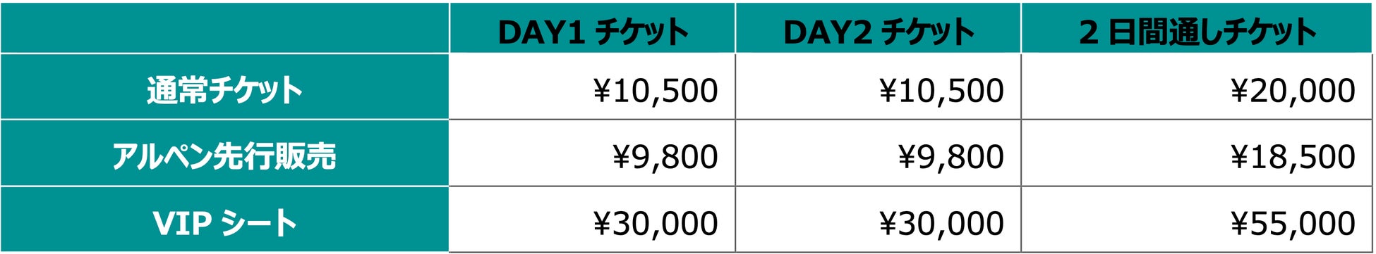 ・通常料金:ブロック指定 10,500円/2日間通し券 20,000円(いずれもゴンドラリフト往復乗車、5線サウスリフト乗車込、入場時別途ドリンク代600円必要)