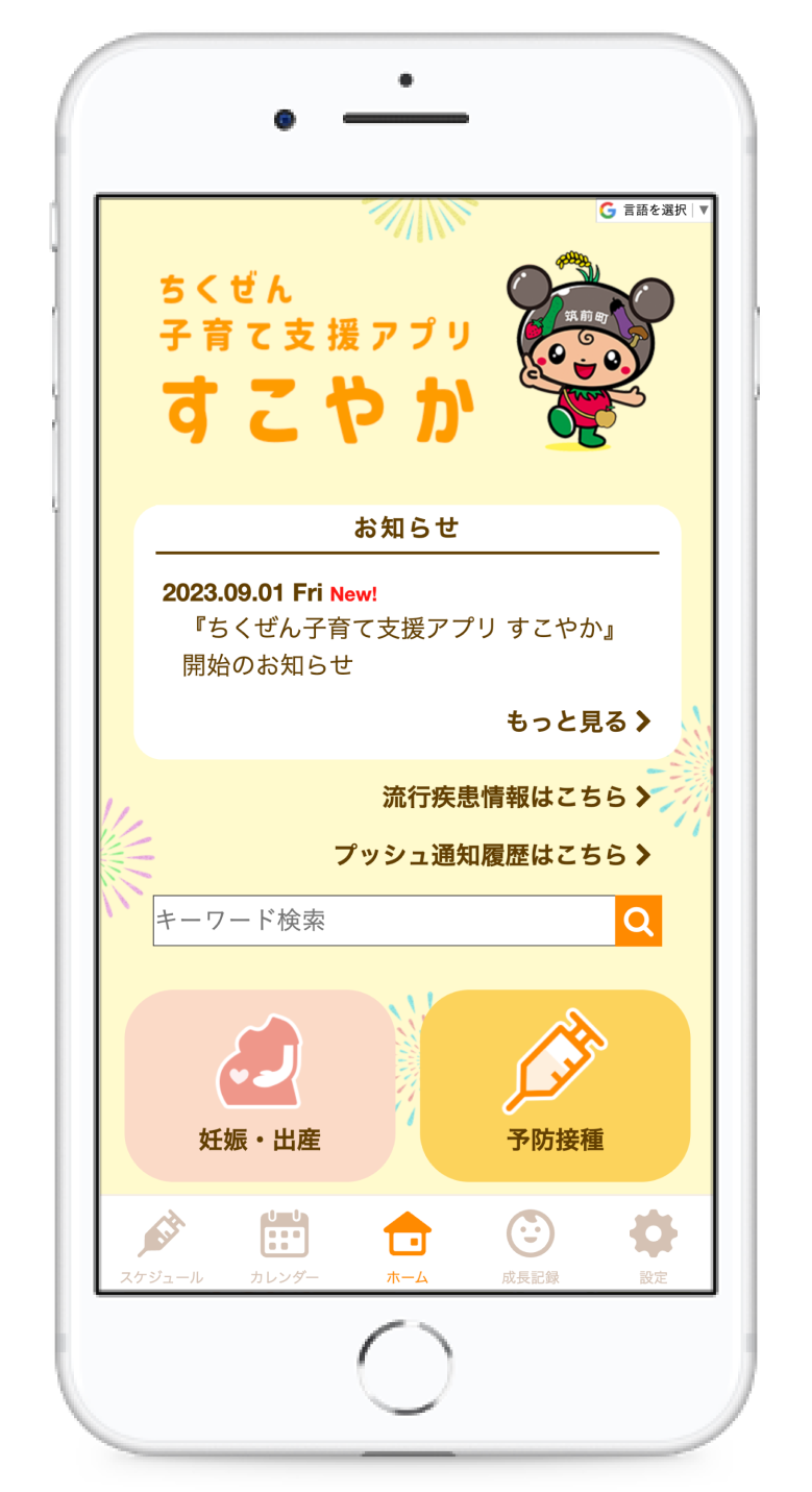 すこやかに成長して欲しいという想いを込めて「ちくぜん子育て支援アプリ すこやか」と命名しました。トップページには、「食の都ちくぜん」マスコットキャラクターの「ちくちゃん」が登場。筑前町らしさが詰まった、こだわりのデザインでお届けします。
