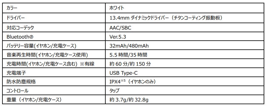 ※5…[IPX4]いかなる方向からの水の飛沫によっても有害な影響を受けません。IPX4の防水認定を受けているのはイヤホンのみで、充電ケースは防水仕様ではありません。汗によるダメージを防ぐため、激しい運動中のイヤホンの装着は避けてください。