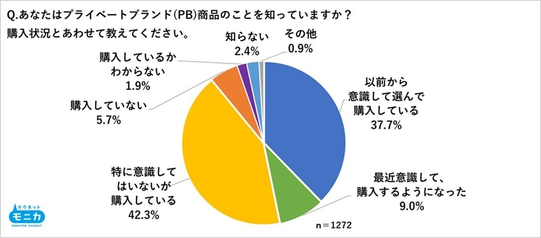 ・約9割がPB商品を購入。「意識せずに購入している」は、約4割、職場でも約3.5割といずれも最多。特別な意識を持たず、生活に定着しているようすがうかがえる。