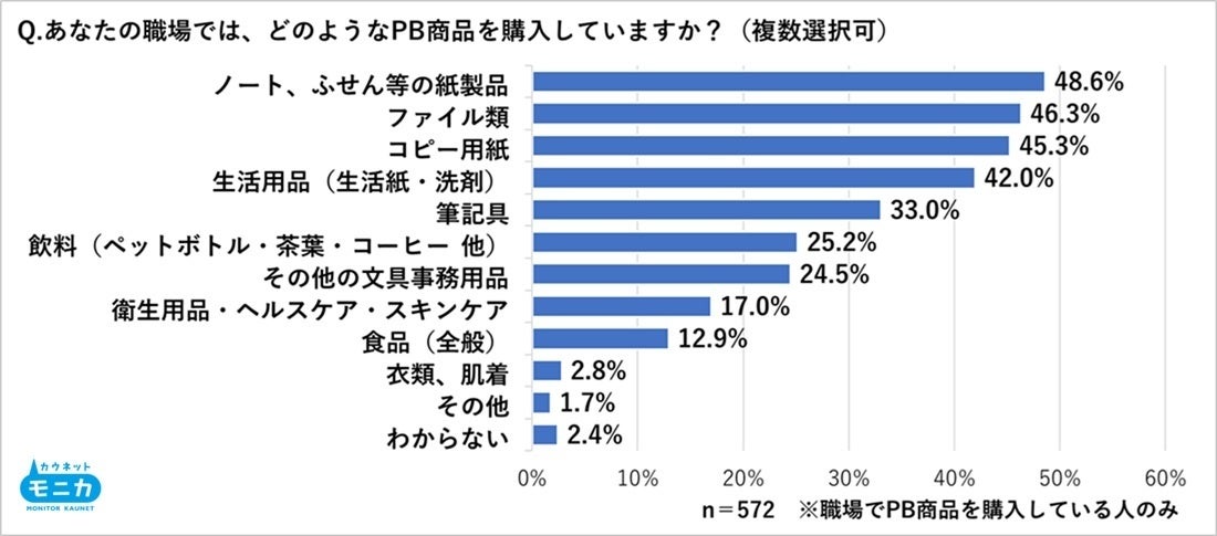 ・職場で購入されているPB商品は「ノート、ふせん等の紙製品」が約5割と最多。文具・事務用品を中心に、日用品や食品にも広がり。