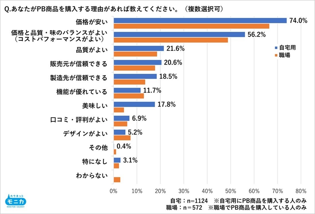 ・PB商品の購入理由は「価格が安い」が自宅(74.0%)、職場(66.2%)でトップ。続いてコスパや品質、信頼性。安さと安心の両立が鍵。