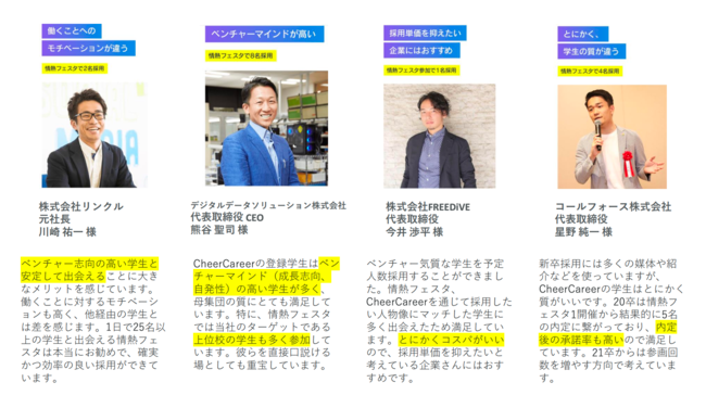 チアキャリアの登録学生はベンチャーマインド(成長志向、自発性)の高い学生が多く、母集団の質にとても満足しています。特に、情熱フェスタでは当社のターゲットである上位校の学生も多く参加しています。彼らを直接口説ける場としても重宝しています。