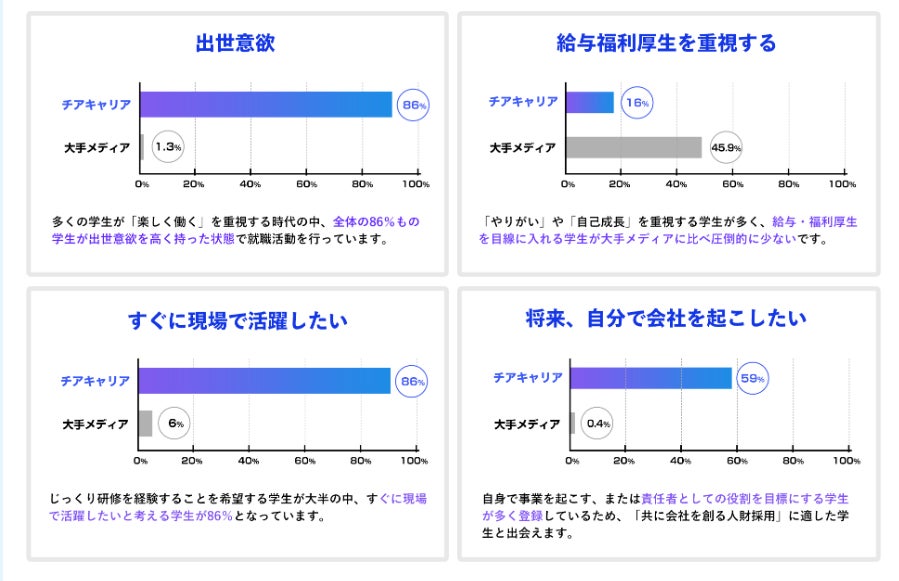 安定や給料よりも“やりがい”を重視する学生が多数。大手企業、安定思考の高い学生が多くいる中、CheerCareer(チアキャリア)ではセミナー・イベントを通じてベンチャーマインドを育んでおります。代表例としてベンチャー企業の代表や役員に多く登壇いただいている「スキルアップスクール」(https://cheercareer.jp/skillup)では、「職能」、「マインド」、「就活力」の観点から社会で活躍するために必要な要素を学習できる啓蒙セミナーを実施。中小・ベンチャー志向の学生が多く媒体上にいる要因となっています。
