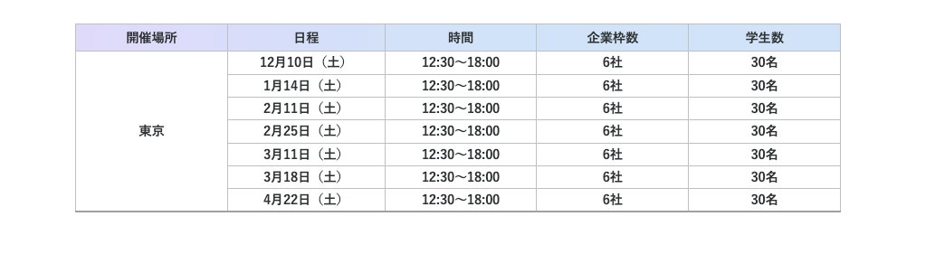 そんな意欲的な学生に対し企業プレゼン、ビジネスゲーム、グループワーク、スカウト面談などを通じて、学生の本音やスキルを見定めやすい企画設計になっており企業側からも、学生側からも、積極的にアプローチすることができるイベントです。