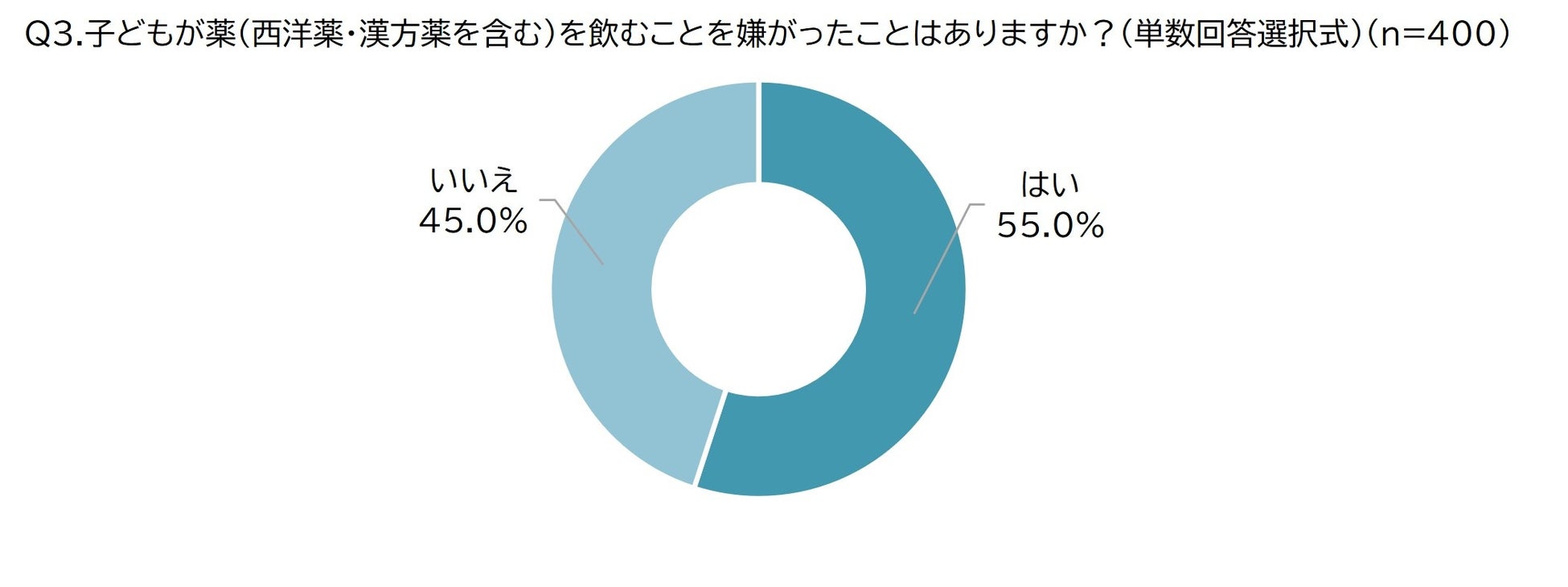 「子どもが薬を飲むことを嫌がったことはあるか」と尋ねたところ、半数以上の母親が「嫌がったことがある」と回答しました。この結果から、多くの母親が子どもに薬を飲ませることに苦労していることがうかがえます。