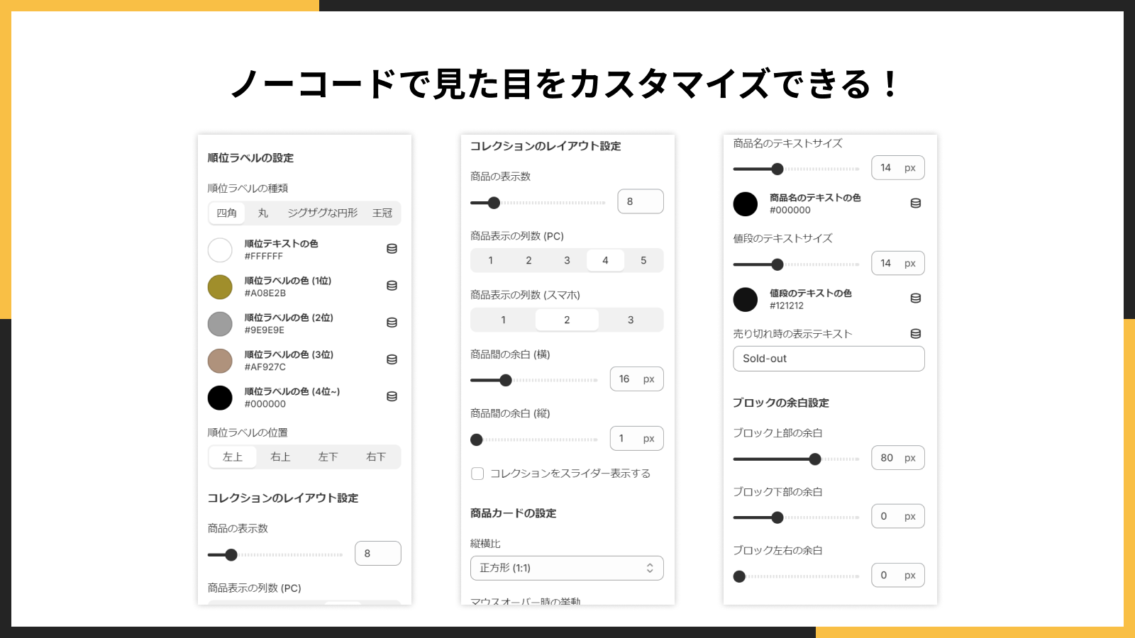 「シンプルランキング表示|お手軽ベストセラー」は、レイアウトや余白、見出しをノーコードでカスタマイズできます。ストアに合ったデザインを実現可能です。