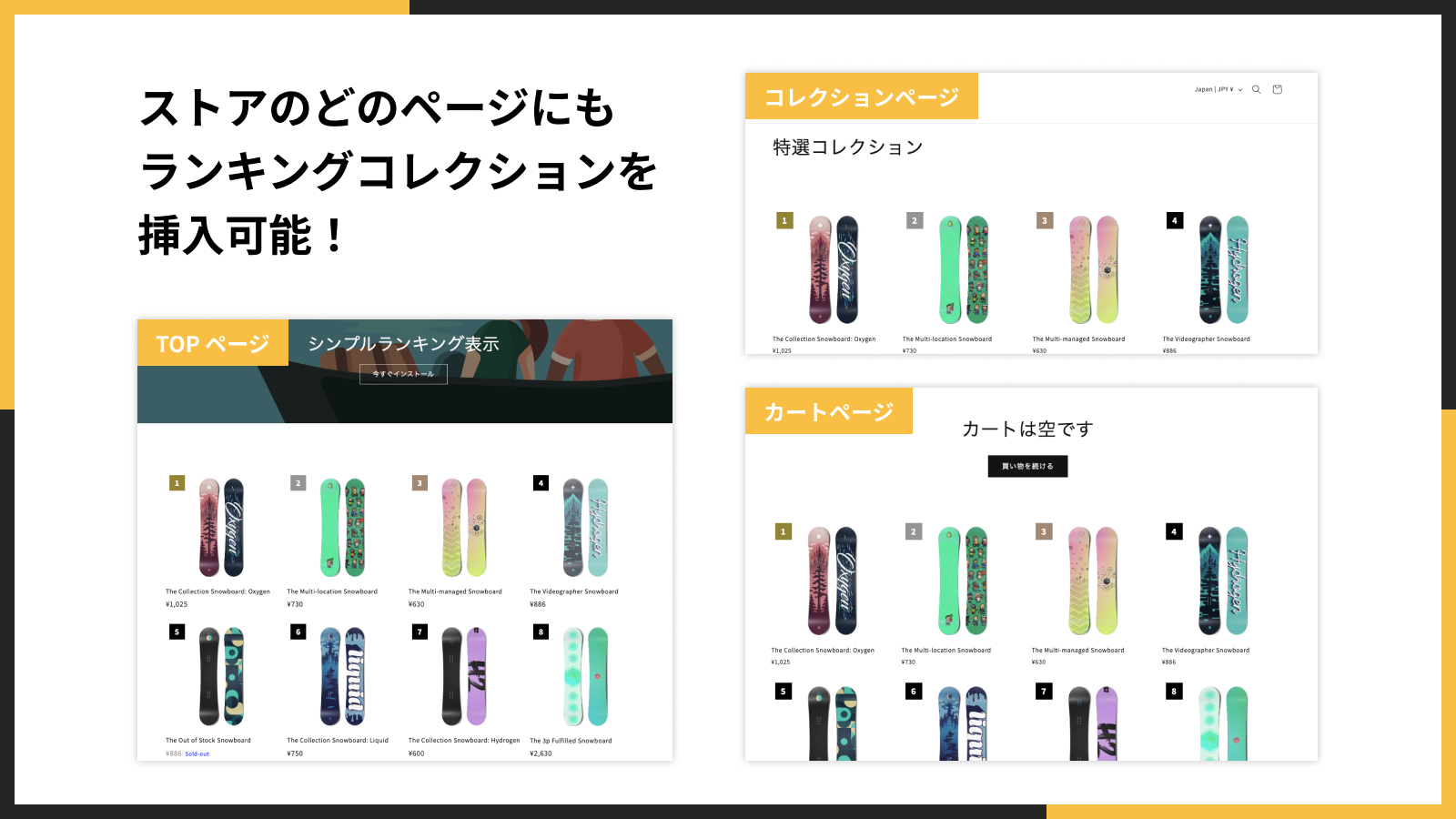 「シンプルランキング表示|お手軽ベストセラー」は、ストアのどのページにもランキングを挿入することができます。