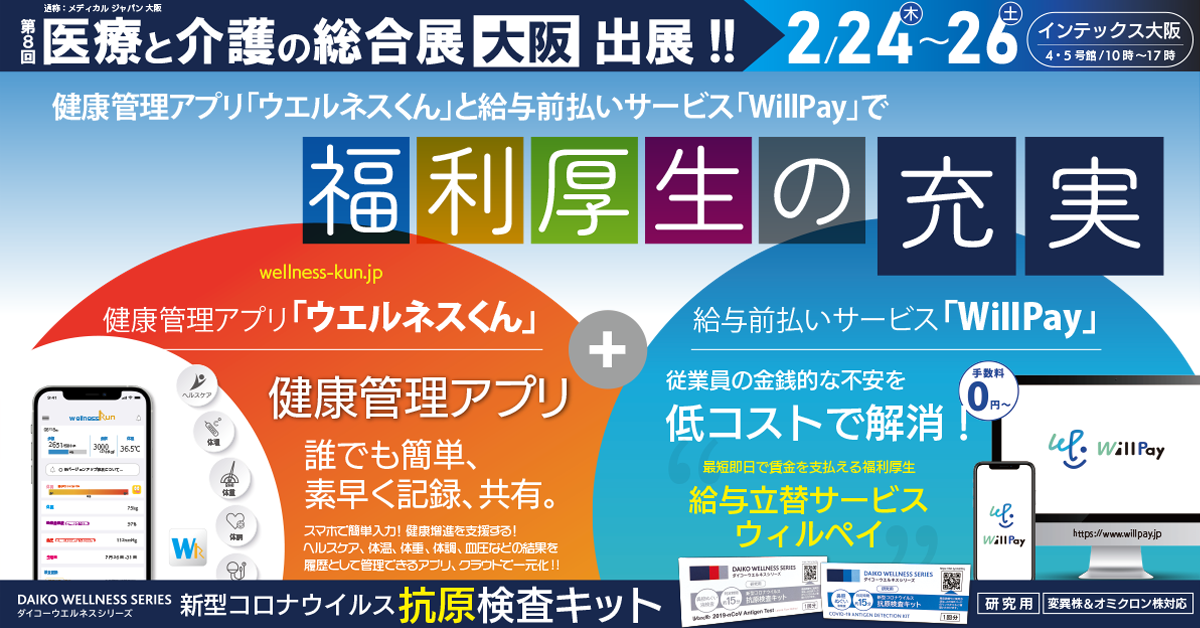 株式会社ダイコーホールディングスグループ(東京都中央区、代表取締役 神⻑ ⼤)は、体調管理機能、イベント時にご活用いただける体調事前申告システム、スマートフォンのヘルスケア機能と連携し機能を充実させた健康管理アプリ「ウエルネスくん」、ダイコーウエルネスシリーズとして販売中の研究用 抗原検査キットについて、2月24日(木)~26日(土)インテックス大阪で開催する医療と介護の総合展に出展いたします。