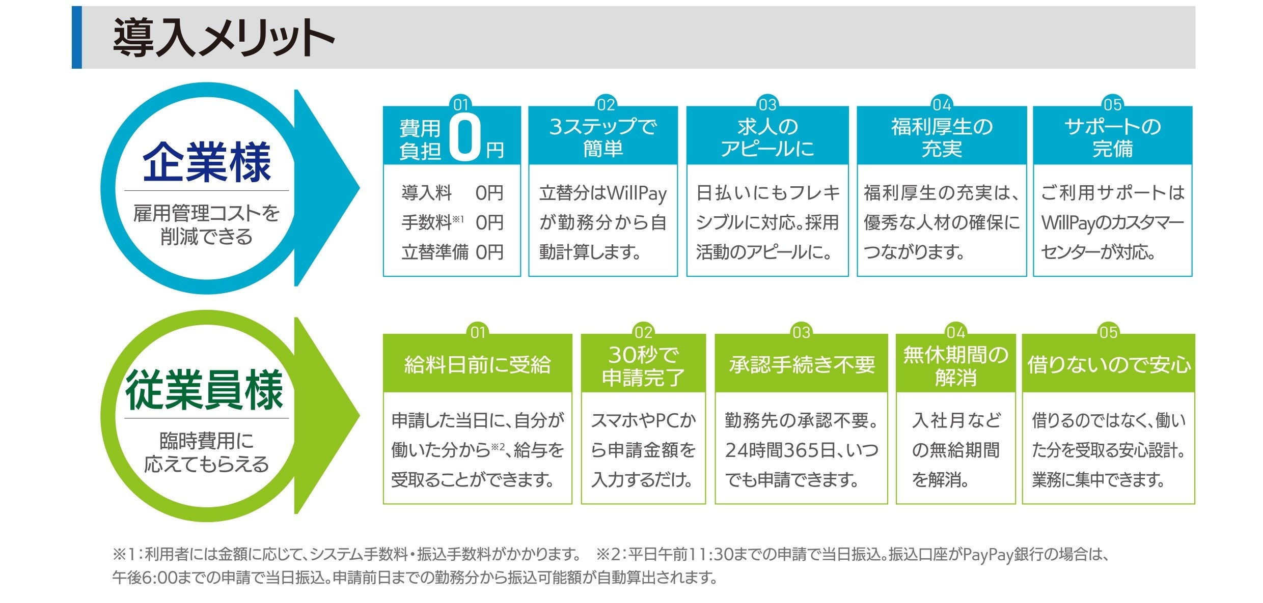 Will Payではサービス会社が金銭を立て替え、利用者の申請も手軽に行えるため、企業と従業員にとって高い利便性を誇ります。