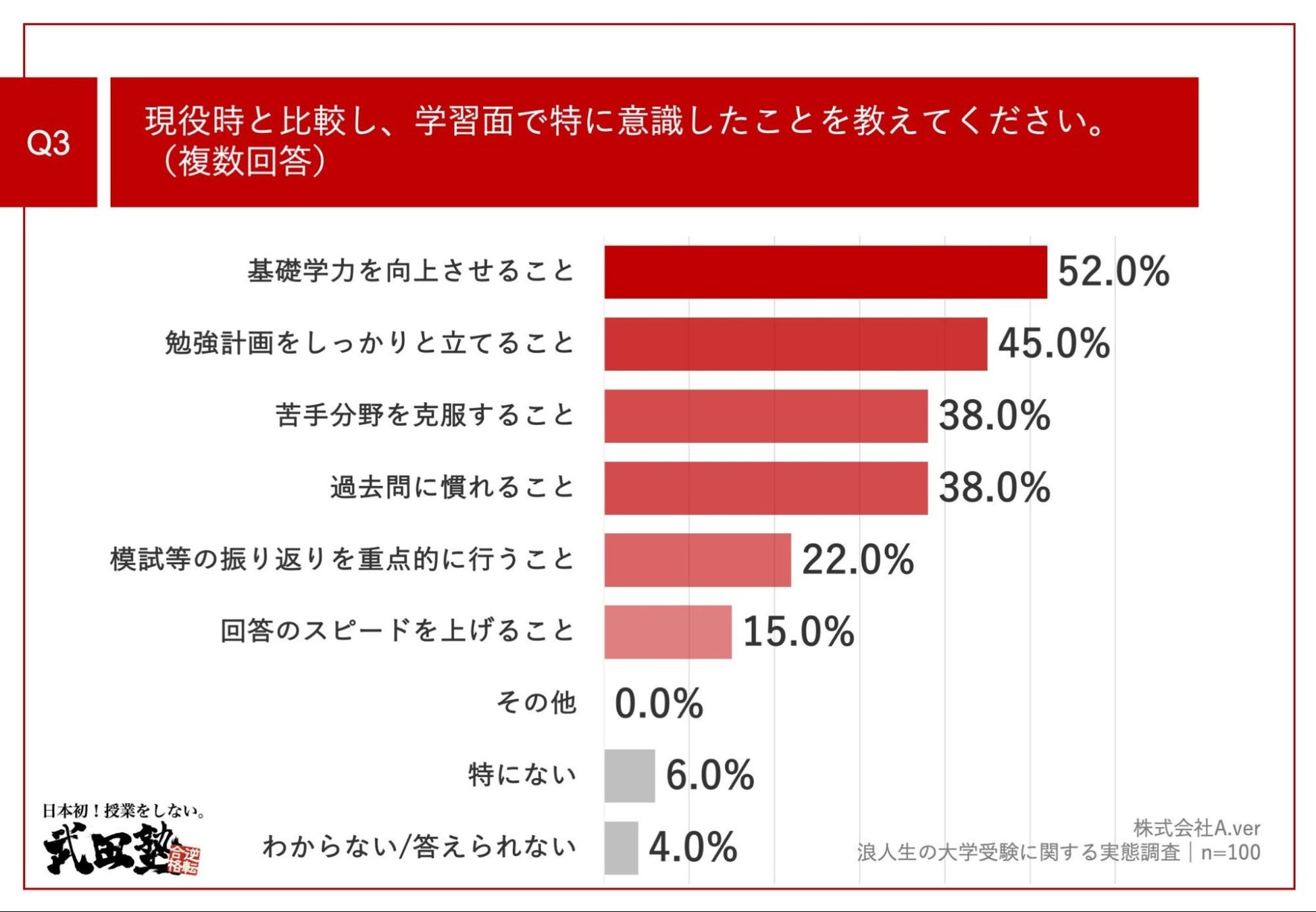 「Q3.現役時と比較し、学習面で特に意識したことを教えてください。(複数回答)」(n=100)と質問したところ、「基礎学力を向上させること」が52.0%、「勉強計画をしっかりと立てること」が45.0%、「苦手分野を克服すること」が38.0%という回答となりました。