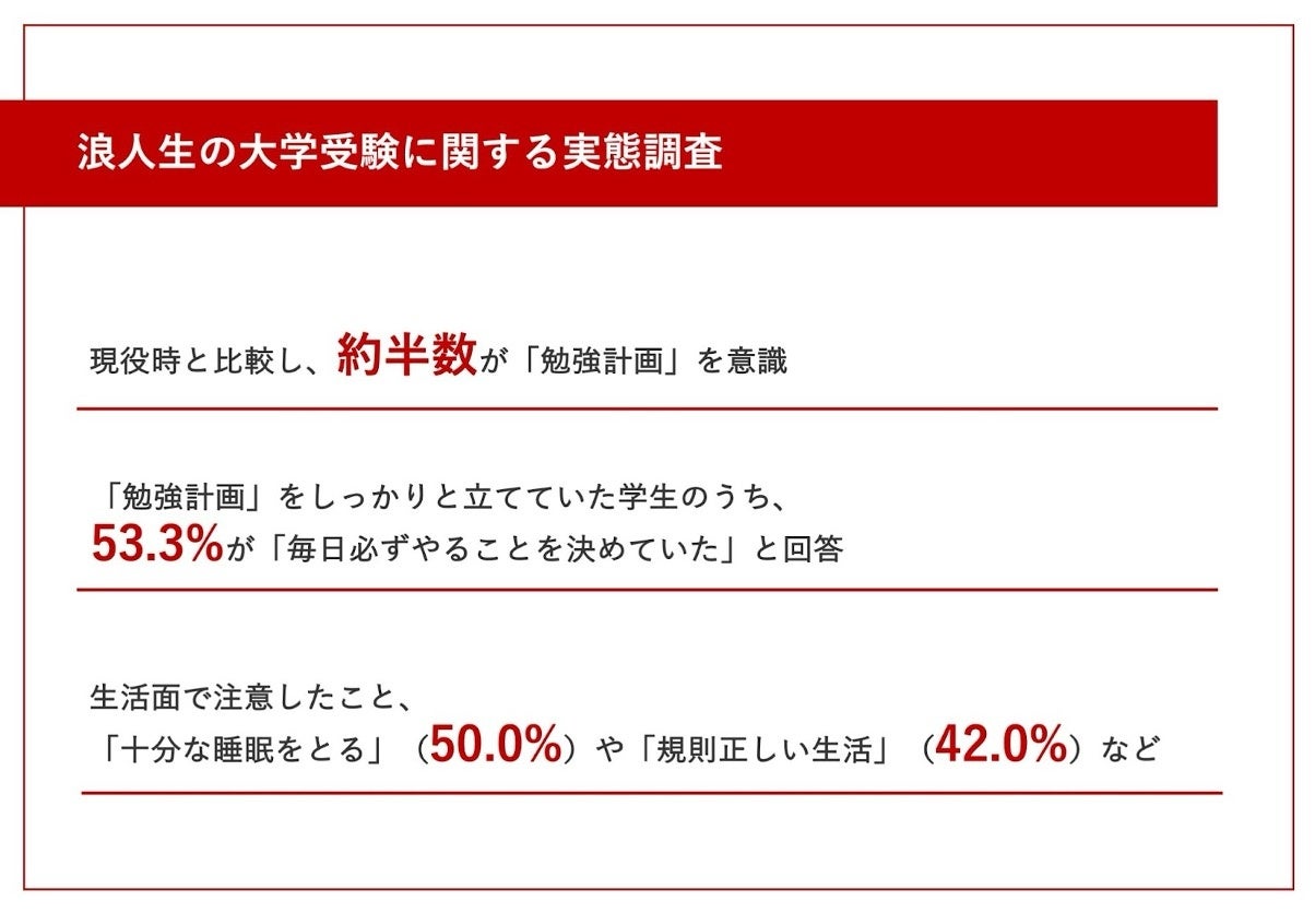今回の調査では、浪人生時代の生活において、意識していたことや、注意していたことなどの実態が明らかとなりました。第一志望を掴み取った背景には、学生生活とは違い、自ら「勉強計画」を立てることが重視されており、また体調管理にも気を配っているようです。これから浪人生活を始める方は、合格を勝ち取った先輩学生の学習面・生活面を参考にしてみてはいかがでしょうか。